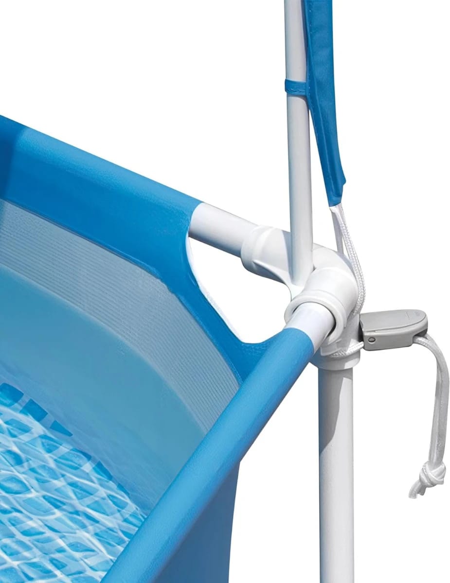 Keep the whole family cool while having summertime fun with the Intex Canopy Shaded Metal Frame Pool. This above-ground pool features a top canopy that provides UPF 50+ sun protection, helping prevent sunburns and allowing for hours of play. The adjustable water sprayer is a great way for kids to stay entertained, while parents can relax knowing their little ones are shaded from harsh rays.